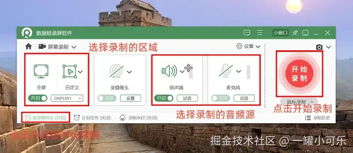 步骤2:在 “屏幕录制” 的界面,设置录制区域,可以选择全屏录制,也可以自定义框选一个区域进行录制。同时,对摄像头、麦克风、系统声音等进行相应的调节设置。如果需要自动结束录制,可以点击 “按时长录制” 进行设置。一切设置好后,点击红色的录制按钮开始录制。