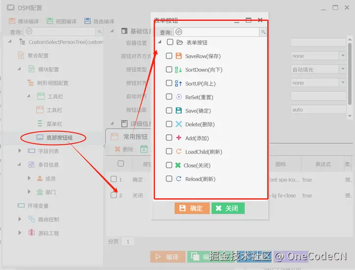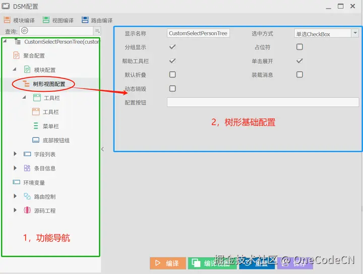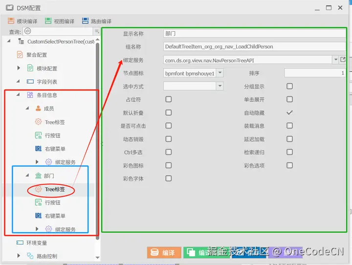 容器配置是作用于所有节点的父级树形设计,但根据树形节点中每一个子节点这需要进行详细配置说明,每一个子几点会有一个“组名称”,用于标识动作及数据展现的作用域,同时对于该节点是否可选(多选、单选),以默认折叠、是否允许延迟加载、是否云讯检索递归这些都会涉及到后端数据的相关属性设计。OneCode将这些属性统一归位到DSM中来管理,在经过编译后分到到前后端的代码执行。