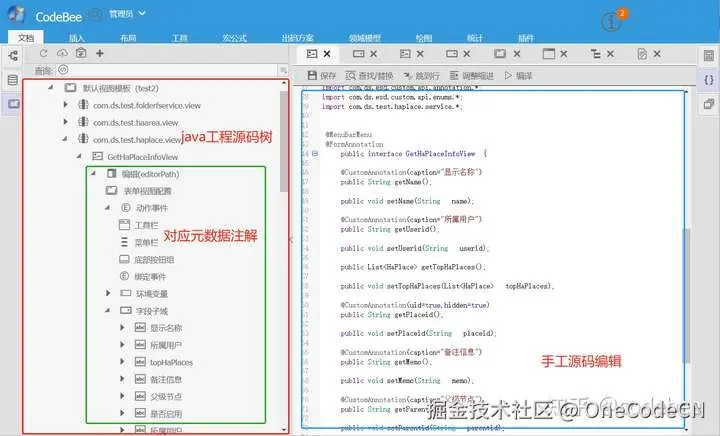 OneCode 元素编辑工具是OneCode领域建模中最为重要的一个工具,OneCode代码工具可以直接读取附有OneCode元数据注解的Java原文件,开发者可以直接手工编辑Java代码。