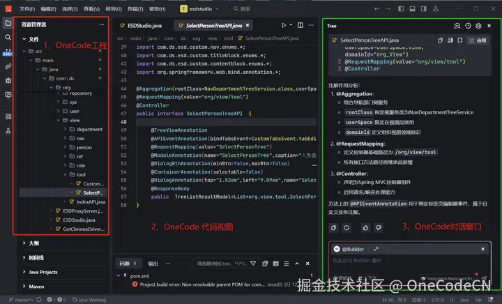 OneCode 3.0升级后全新支持了 AI原生编译器(AI-Ide) ,在完成图形配置和DSM建模后,通过出码工厂配置编译可以生成基于Spring配置的 OneCode 原生的PerCode代码。并且在最新的版本中增加了对原生 AI原生编译器(AI-Ide) 的支持,使得OneCode编译工程的同时可以使用Trae 来同步修改代码。
