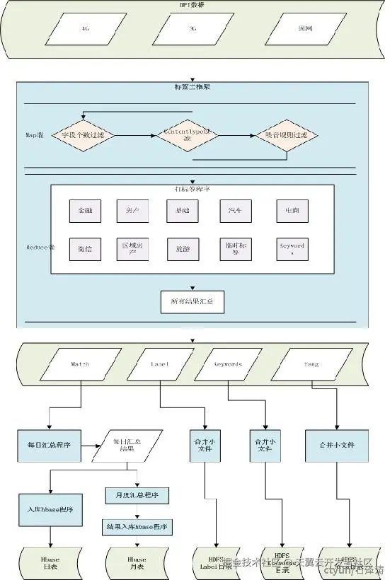通过读取DPI数据并对数据进行过滤、去噪音处理,再把数据依次传给A、B、C标签程序, A、B、C标签程序通过对传进来的DPI数据分别进行匹配,最终将结果发给框架程序,由框架程序汇总后输出到HDFS