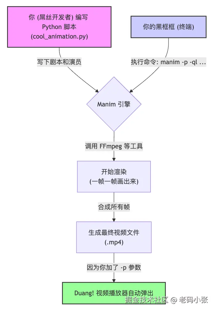 看明白了吧?你就是总指挥,写好 Python 脚本,然后用 manim 命令一回车,剩下的脏活累活它全包了,最后直接把成品视频喂到你嘴边。
