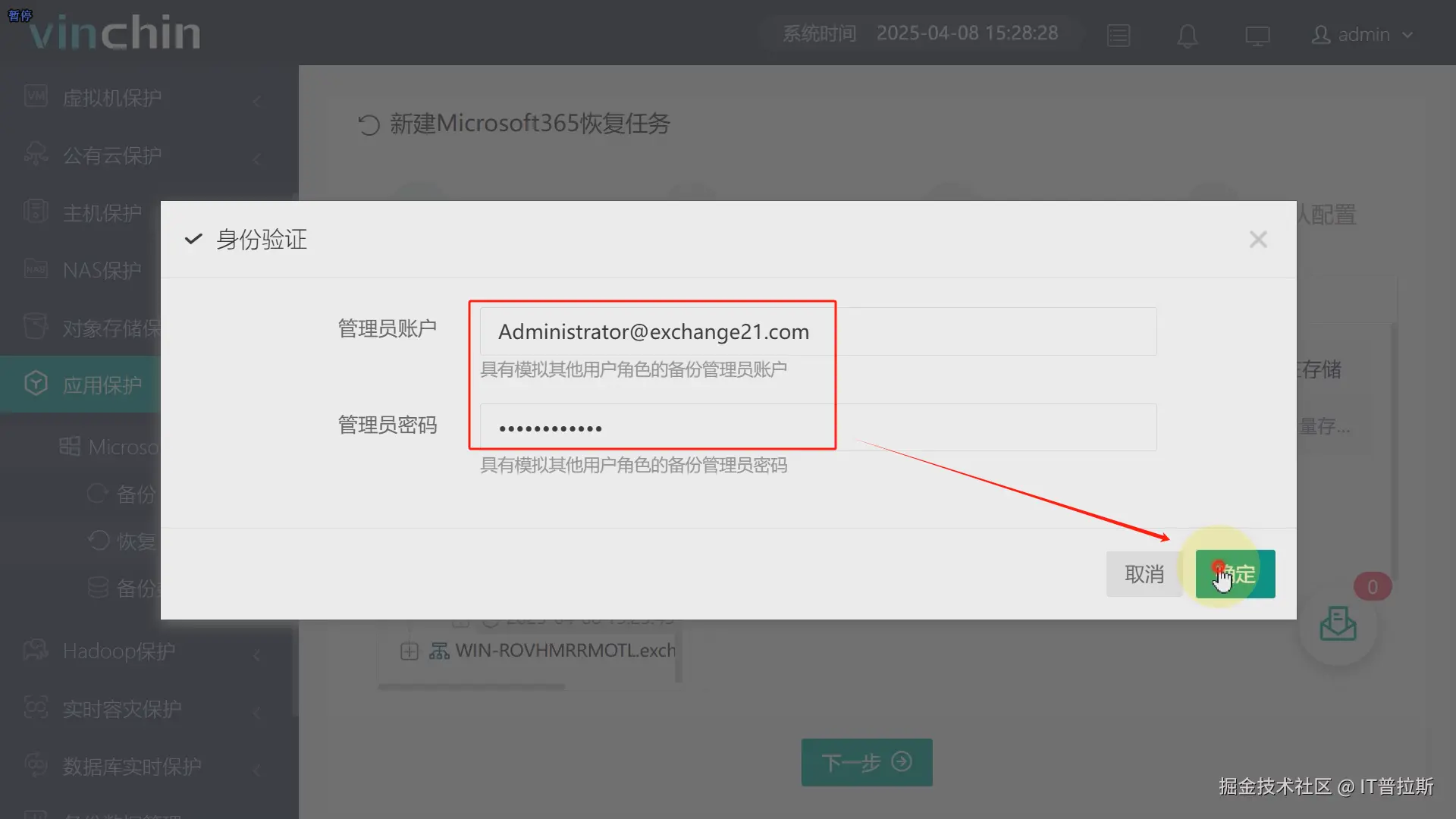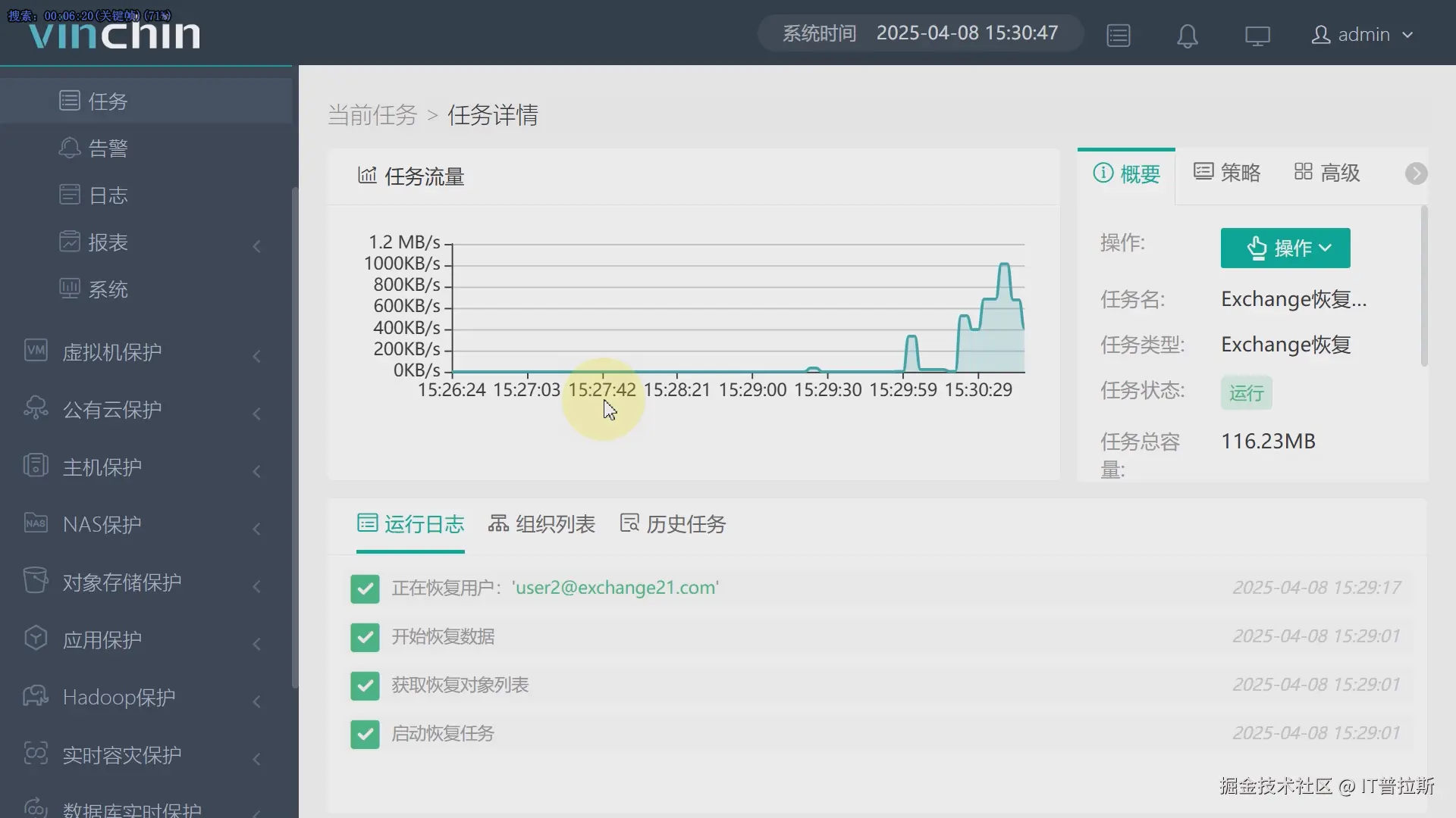 点击公有应用保护、Microsofit365保护、恢复,选择需要恢复的数据,并输入Exchange Server管理员账号密码,点击下一步,勾选目标组织,选择覆盖恢复,点击下一步,通用策略、传输策略、高级配置以系统默认为例,点击下一步,再次确认任务名称以及配置信息,准确无误后点击提交,恢复任务将立即执行,点击任务名,可查看任务详情,任务执行完成。如图17至图23。