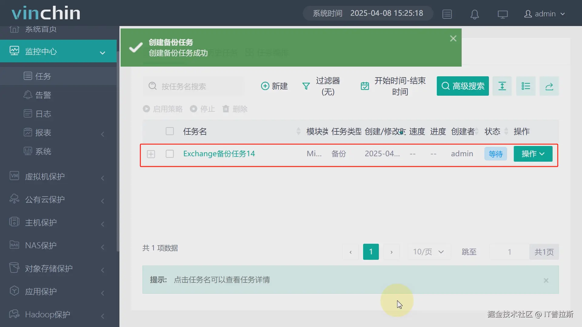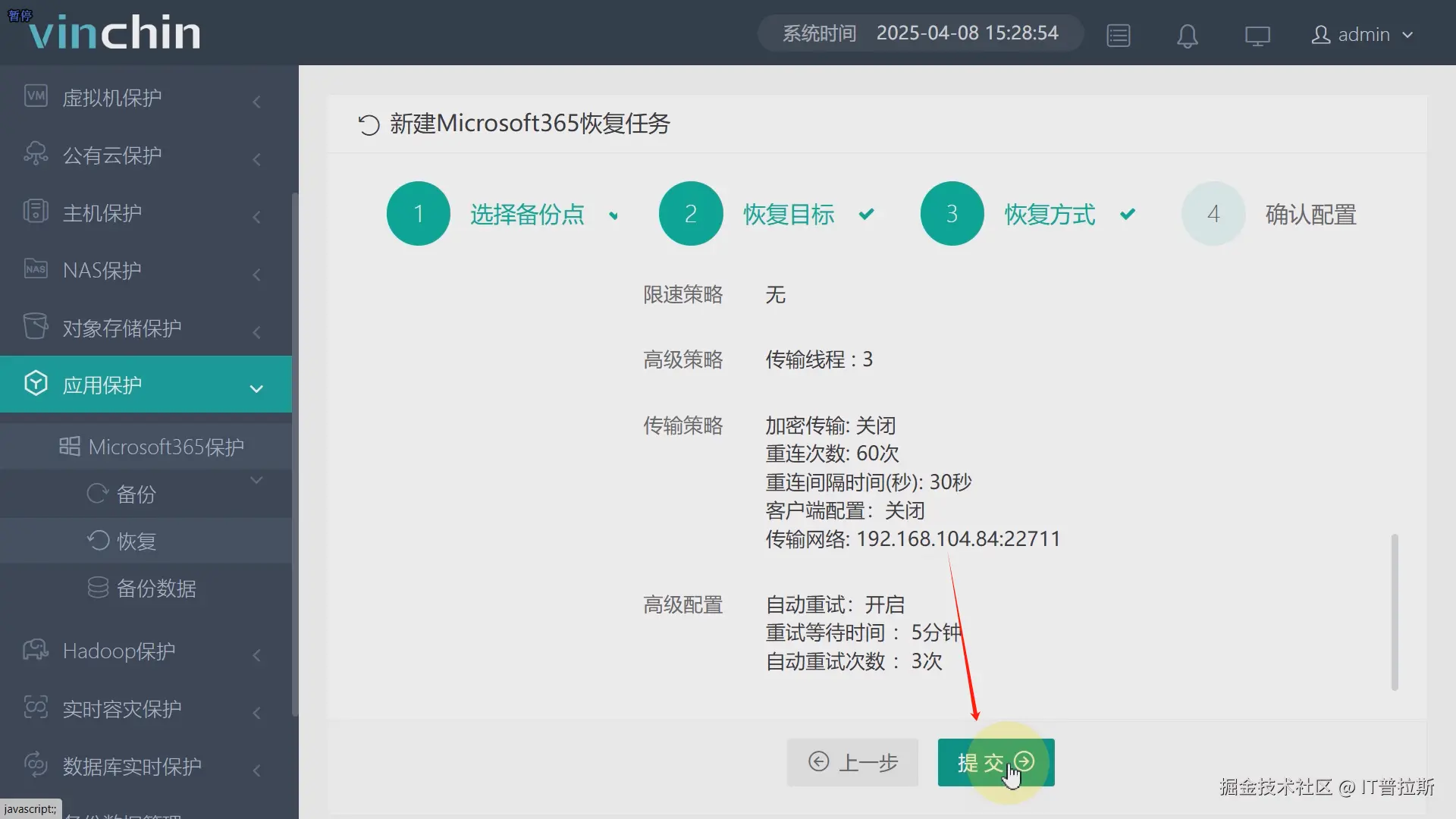 点击公有应用保护、Microsofit365保护、备份,展开Exchange Server组织并勾选需要备份的的用户数据,支持多选或选择整个组织,本文档以勾选其中一个用户为例,点击下一步。计算节点与目标存储本次演示以系统默认为例,点击下一步。时间策略则以永久增量备份为例,执行时间以及其他参数以系统默认为例,再切换至传输策略,点击下一步,核对任务信息,准确无误后点击提交,备份任务就创建完成了,后续该任务会自动定期备份所选用户的邮件数据。如图12至图16。