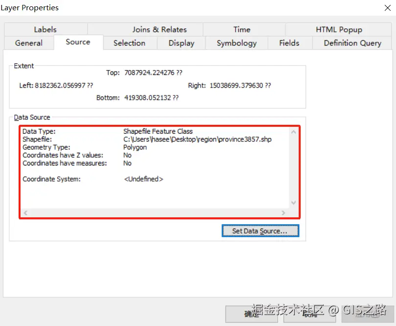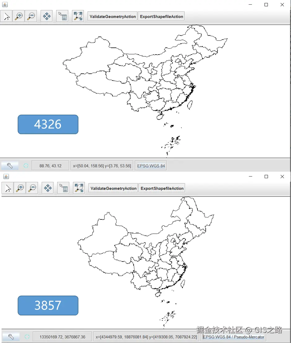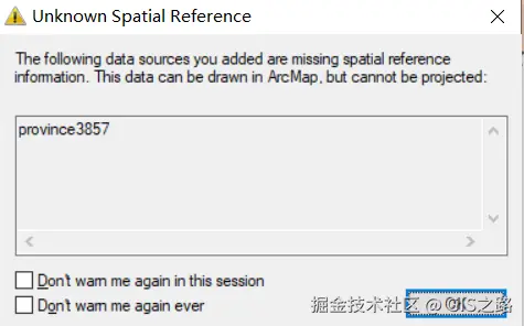 注:使用此方式重投影Shapefile数据时,.prj文件已经生成,而且坐标也显示正确,但是在GIS软件ArcMap中打开时会提示缺少坐标参考信息。