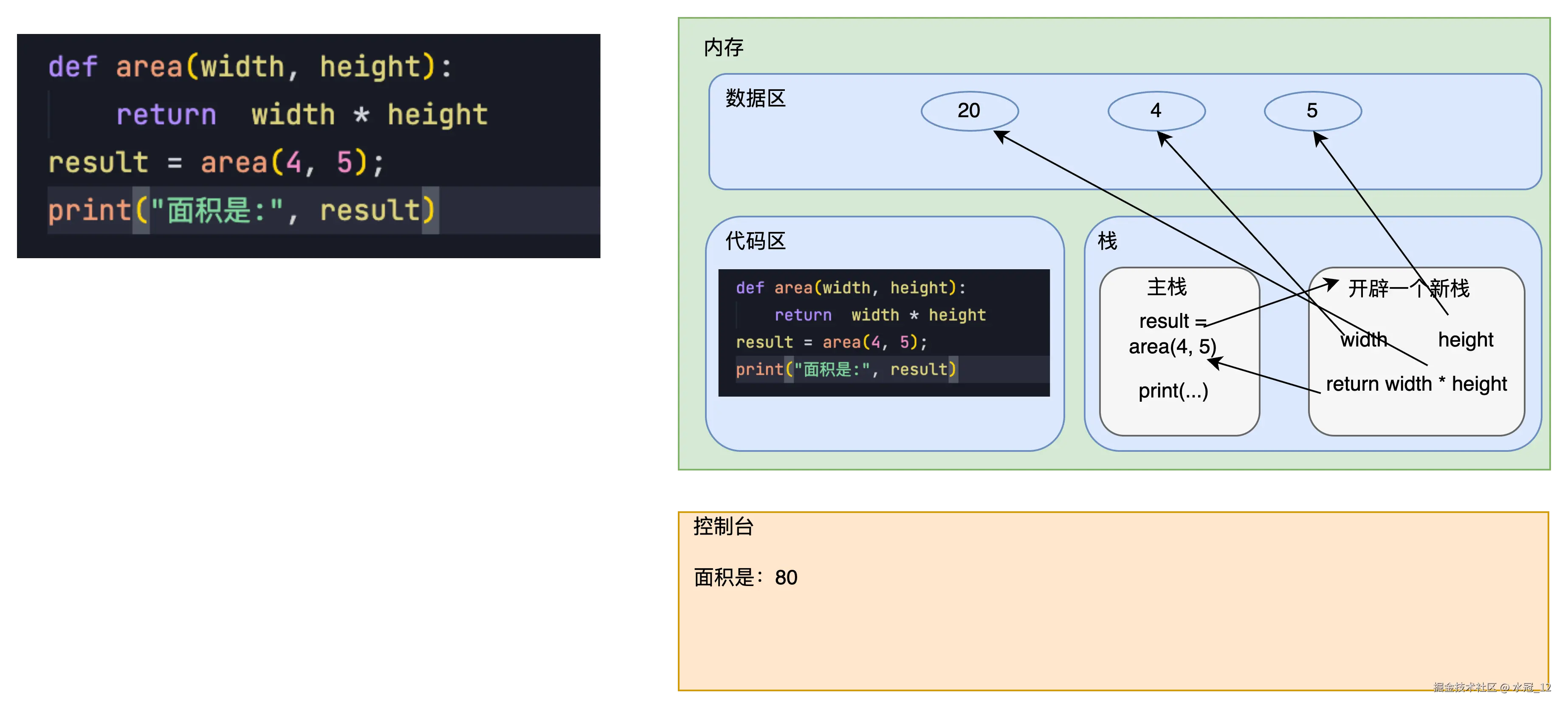 result = area(4, 5)开始 - 此时会调用 area()函数,会开辟一个新栈。实参 4, 5 会被分别传递给参数 width 及 height,此时数据区会创建一块区间用来存放变量 width 和 height 的值