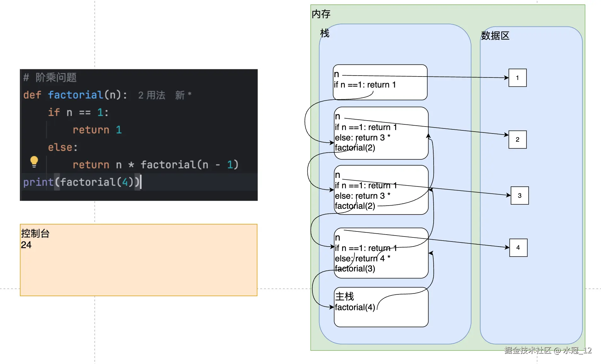 20返回给调用方也就是主栈 result,此时会释放这个栈空间 - 继续执行主程序