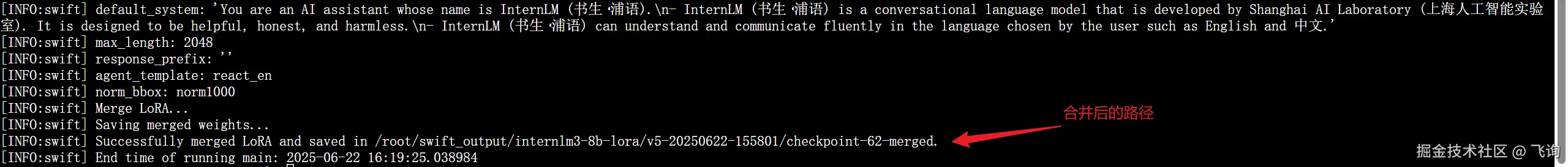 # /root/swift_output/internlm3-8b-lora/v5-20250622-155801/checkpoint-62-merged:合并权重后的模型参数路径