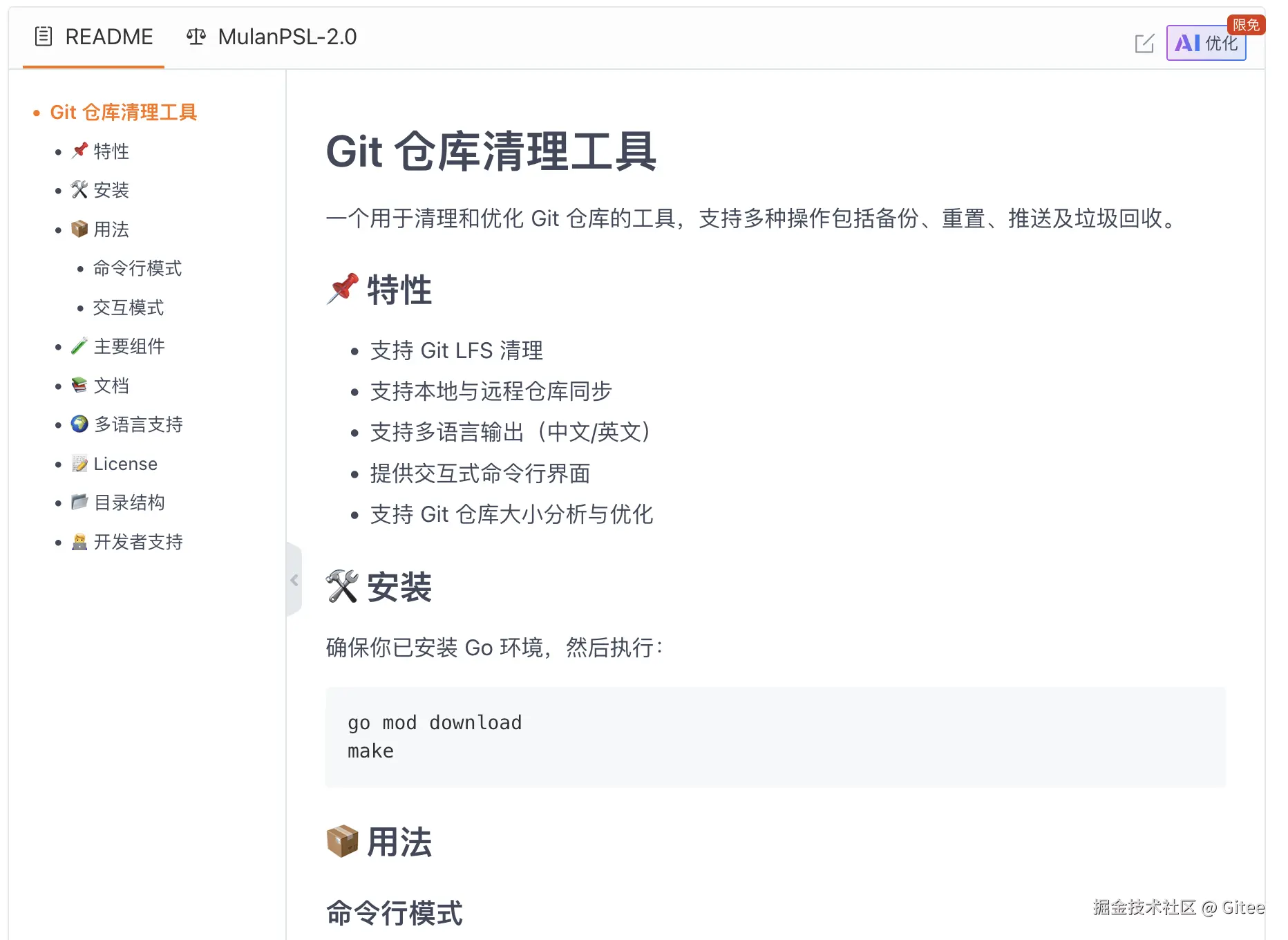 现在,Gitee 帮你解决这个老大难问题——全新上线的「AI README 生成与优化」,能一键生成结构清晰、内容专业的项目文档,还能自动优化现有 README,让你的项目门面焕然一新!