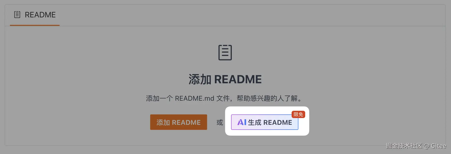 Gitee 会自动检测是否存在 README。若缺失,将显示「AI 生成 README」按钮。