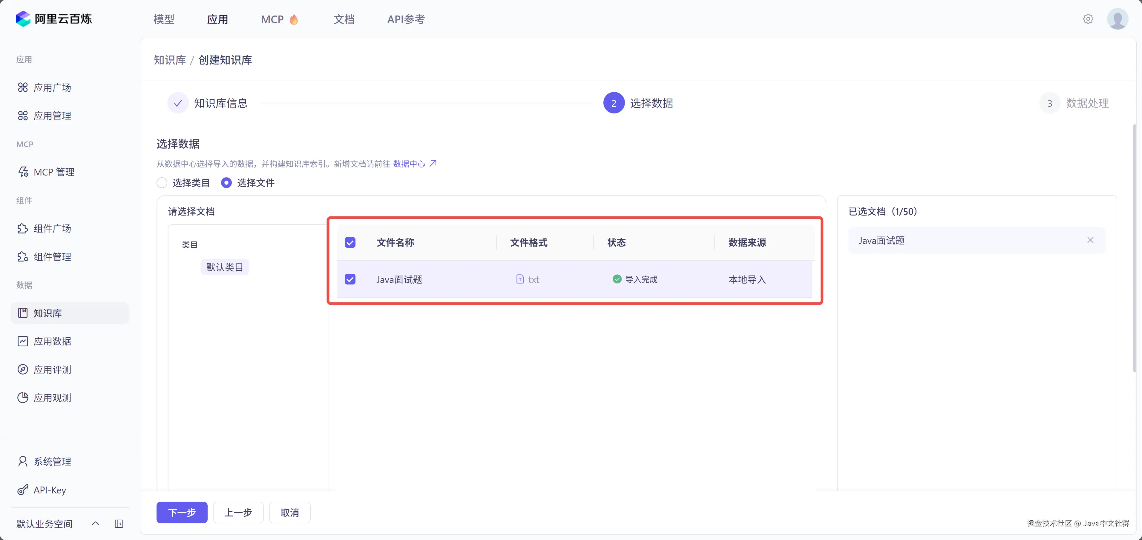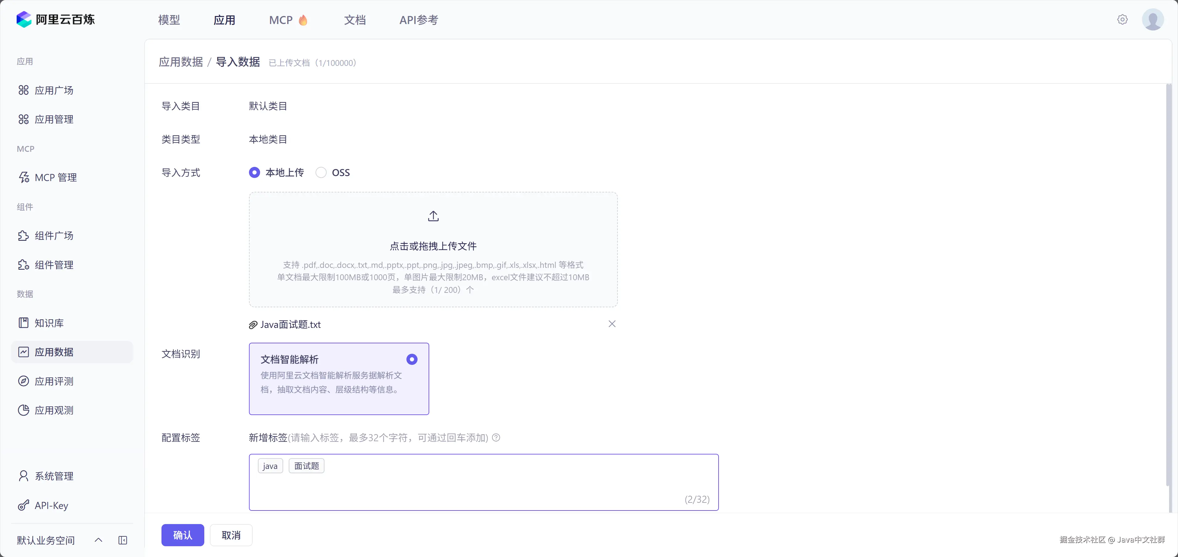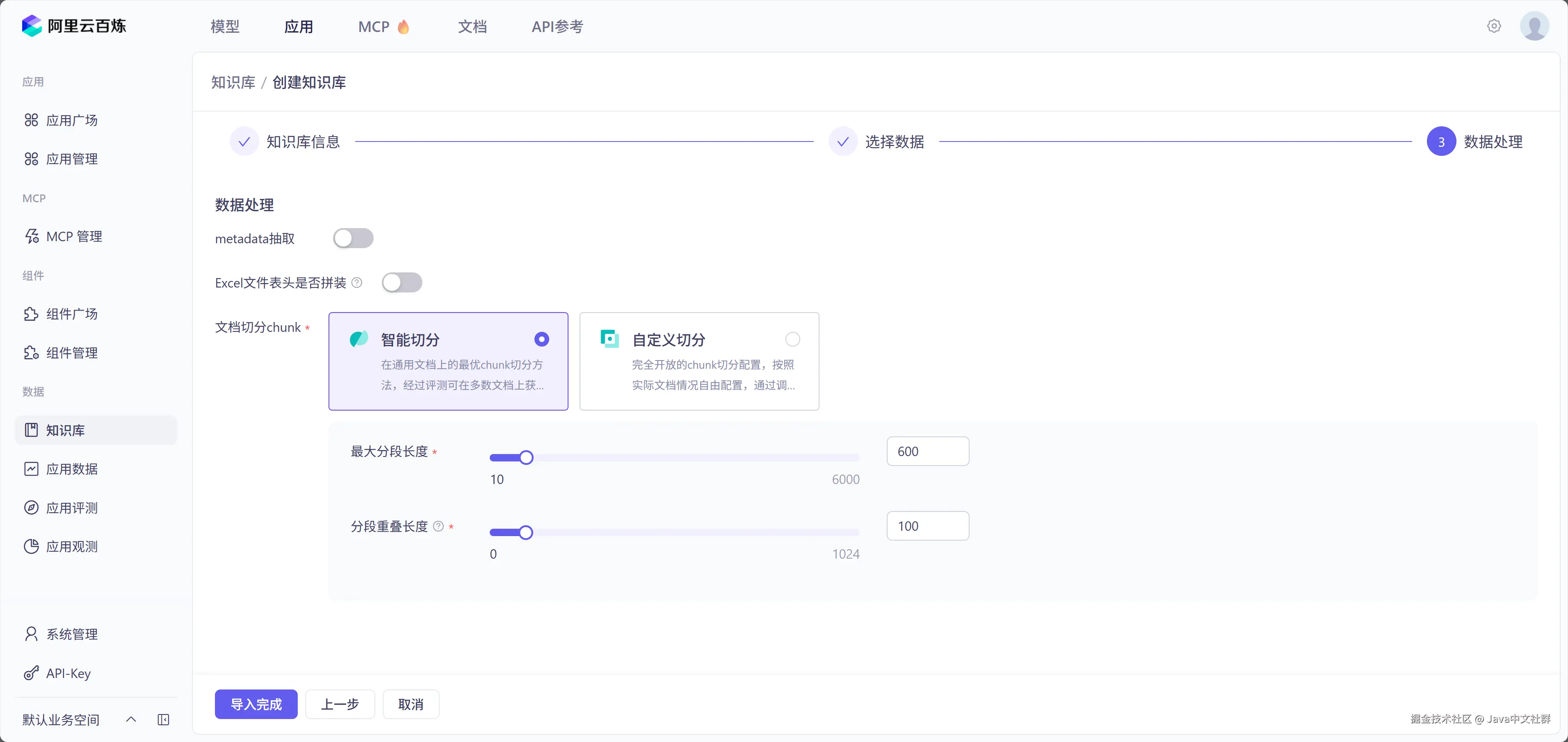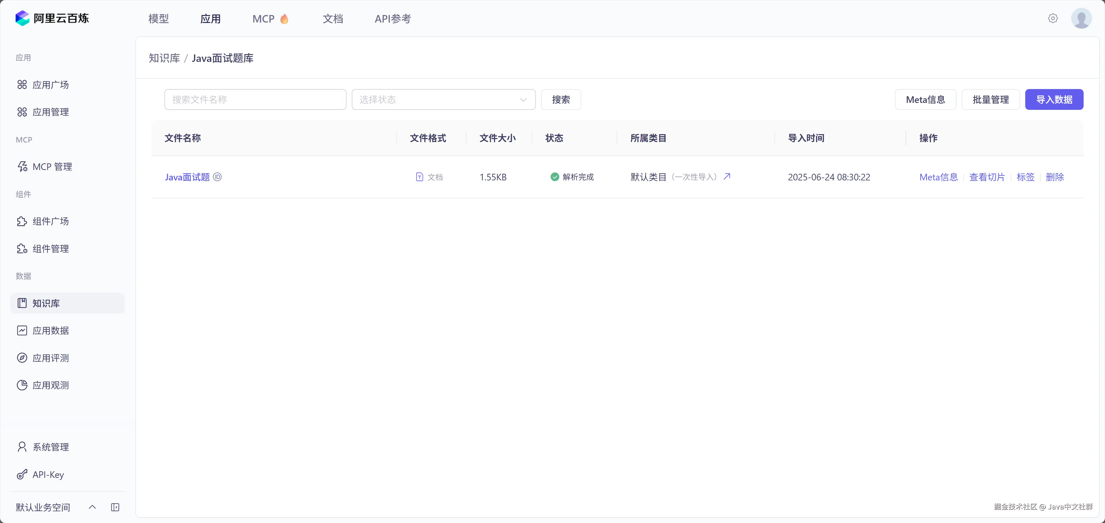 在 Spring AI Alibaba 程序中,我们可以直接使用本地程序调用百炼平台的云知识库,实现知识库文档解析、分块、向量化存储等一条龙服务。