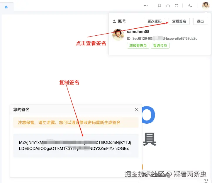 - 登录后,点击右上角用户信息卡片中的"查看签名"按钮