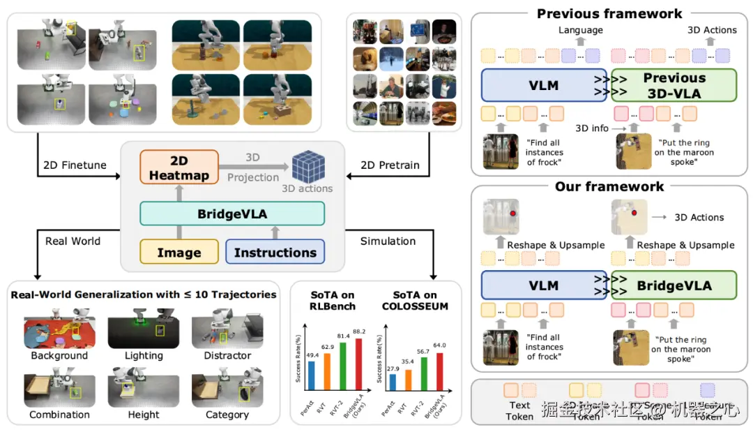 为了解决上述问题,中科院自动化所谭铁牛团队联合字节跳动 Seed 推出 BridgeVLA,展示了一种全新的 3D VLA 范式,实现了模型能力与数据效率的同步飞跃,并斩获了 CVPR 2025 GRAIL workshop 的 COLOSSEUM Challenge 冠军。目前代码与数据已经全面开源。