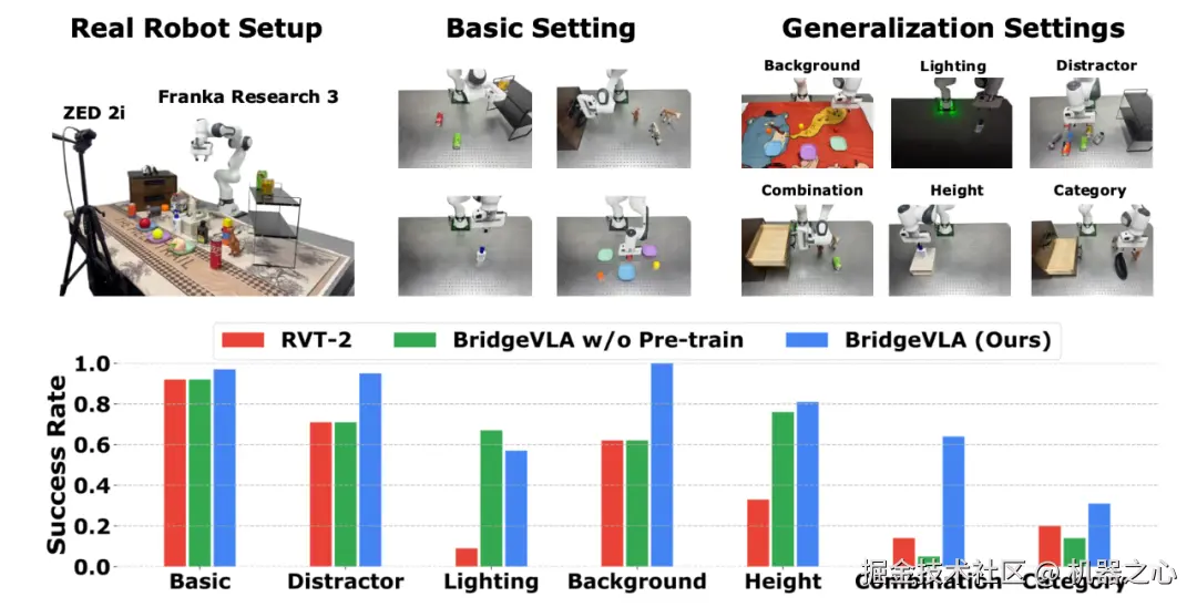 在真实世界评测中,作者设计了 13 个基本任务,并设计了 6 种不同的泛化性能测试(包括干扰物体、光照、背景、高度、组合和类别)以全面评估模型性能。如图所示,BridgeVLA 在七种设置中的六种中均优于最先进的基线方法 RVT-2。