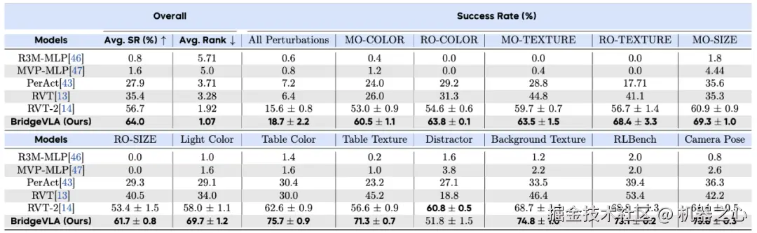 COLOSSEUM:作为 RLBench 的扩展,COLOSSEUM 基准专注于评估模型在 12 种扰动(包括物体纹理、颜色、大小、背景、光照、干扰物和相机姿态变化等)下的泛化能力和鲁棒性。BridgeVLA 在 COLOSSEUM 基准测试中展示了强大的鲁棒性,平均成功率从 56.7% 提升到 64.0%,并在 14 种评估扰动中的 13 种中表现最佳。