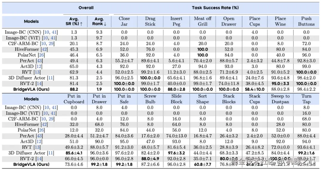 RLBench:实验在 18 个复杂的 RLBench 任务上进行,包括非抓取操作任务、抓取放置任务和高精度插入任务等。BridgeVLA 在此基准测试中显著优于所有现有基线方法,将平均成功率从 81.4% 提高到 88.2%,并在 18 个任务中的 10 个中取得了最佳表现,尤其在需要高精度对齐的任务(如「Insert Peg」和「Sort Shape」)中表现突出。