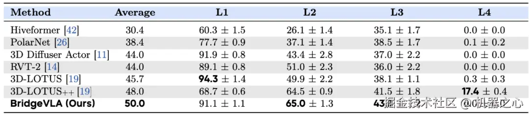 GemBench:该测试基准分为四个挑战性递增的层次(L1-L4),涉及新颖的放置、刚性物体、关节物体以及需要组合多个动作才能完成的长周期任务。BridgeVLA 在这四个评估设置中取得了最高的平均成功率,尤其在 L2 和 L3 设置中取得了最先进的成果,证明了其强大的泛化能力。然而,与大多数基线方法类似,BridgeVLA 在 L4(长周期任务)设置中的表现仍然有限。