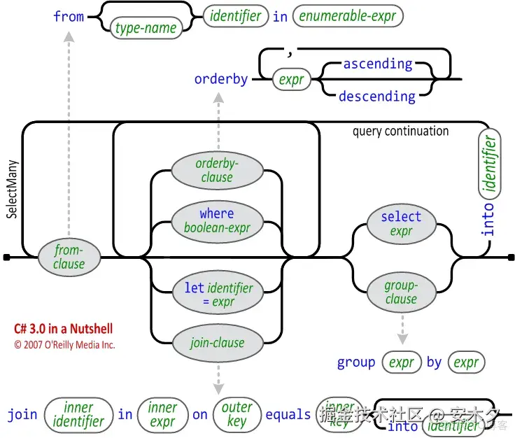| 常用方法/语法 | System.Linq 上提供的扩展方法或第三方扩展:Where、OrderBy、Select、Skip、Take、Union | 仅支持编译器识别的关键字:from、where、orderby、group、join、let、select、into、in、on等 |