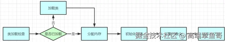 虚拟机遇到⼀条 new 指令时,⾸先将去检查这个指令的参数是否能在常量池中定位到这个类的符号引⽤,并且检查这个符号引⽤代表的类是否已被加载过、解析和初始化过。如果没有,那必须先执⾏相应的类加载过程。类加载过程包括了加载、连接、初始化三个阶段,其中连接还可以分为验证、准备、解析