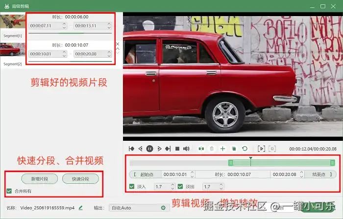 步骤3:录制完成后,可以在预览页面右下角选择 “高级剪辑” 工具,对视频进行快速分段、增加淡出等特效。