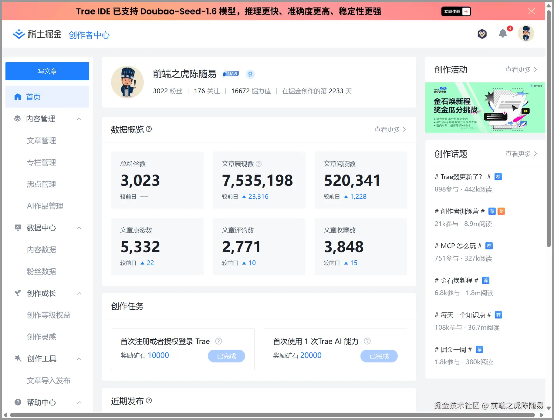掘金发了 188 篇文章,涨粉 3000。