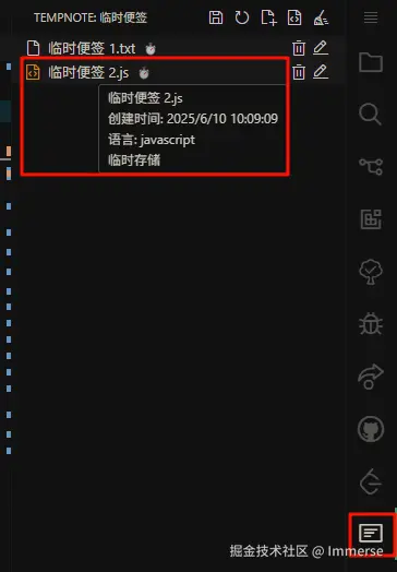 Temp Note: 一个轻量级的 VS Code 插件,提供快速创建临时文件的功能,用于记录临时想法、测试代码片段、粘贴临时数据等。支持临时模式和持久化模式。