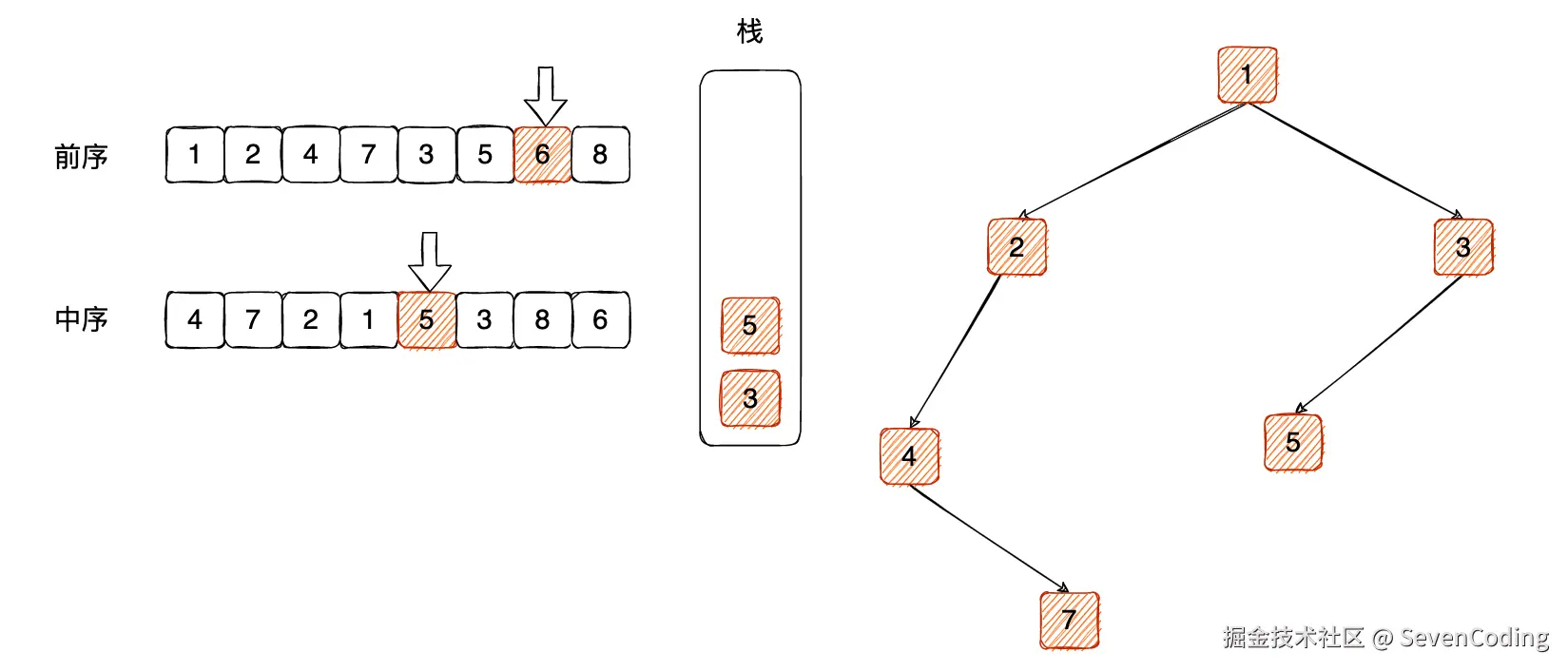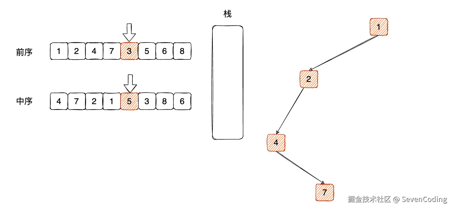 再次循环,判断中序遍历的数值和栈顶元素不相等,那么说明是左⼦树,前序遍历中的 5 压⼊栈内,索引后移: