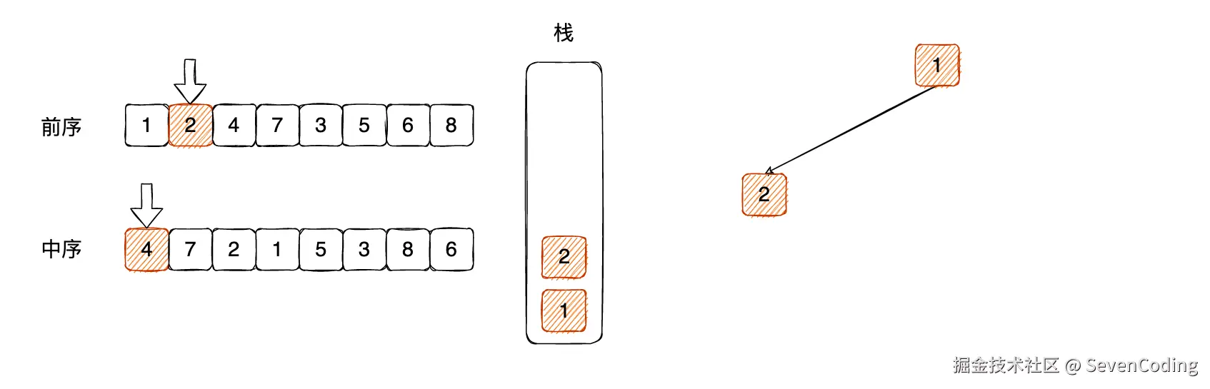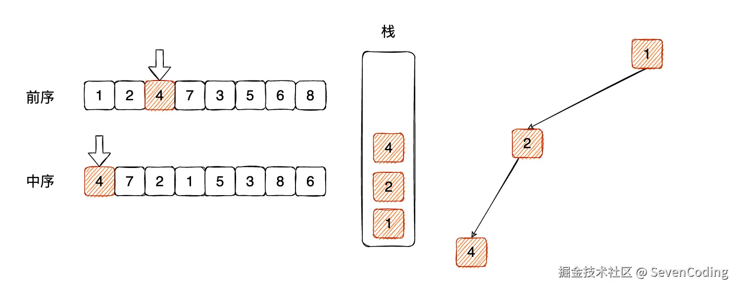 对⽐中序遍历第⼀个元素 4 ,和栈顶元素 1 ,不相等,那么说明有左⼦树,前序遍历的第 2 个元素 2就是左⼦树节点,关联成左⼦树,压栈: