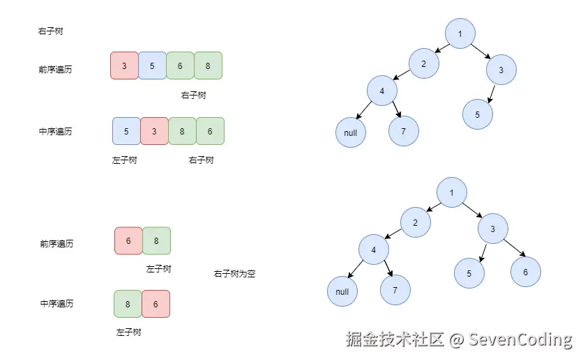 - 如果不相等,说明当前栈顶元素还有左⼦树,因为如果没有左⼦树的话,前序的第⼀个元素和中序的第⼀个元素应该相等。既然有左⼦树,那么前序遍历指针指向的元素就是它的左⼦树根节点,建⽴关系,压栈。