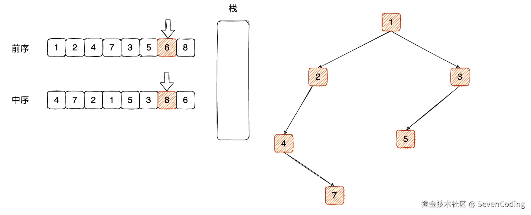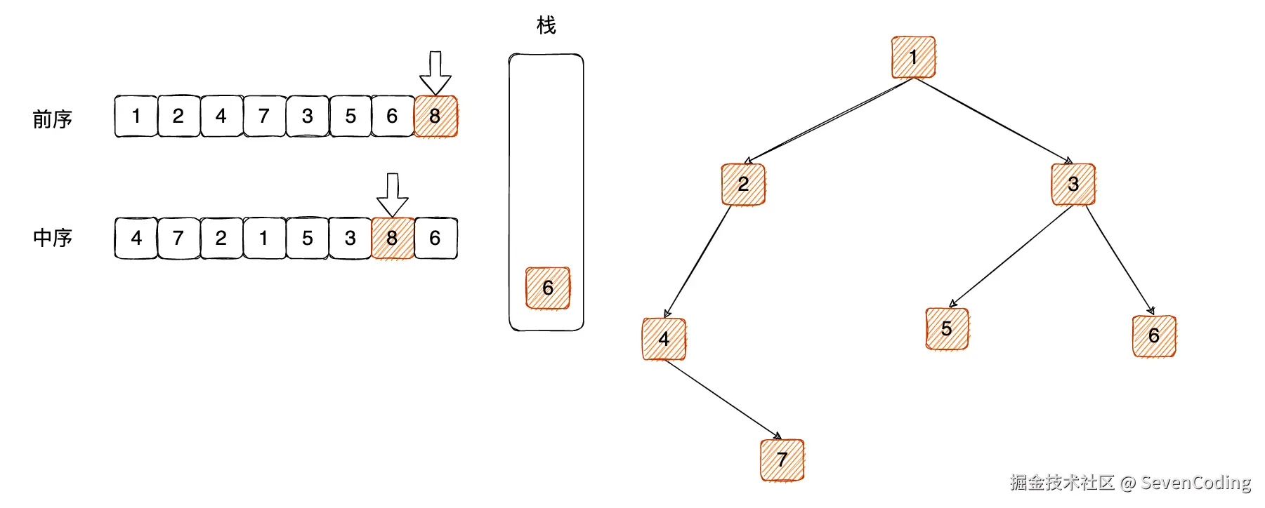 对⽐栈顶元素 8 和中序遍历的 8 ,相等则弹出: