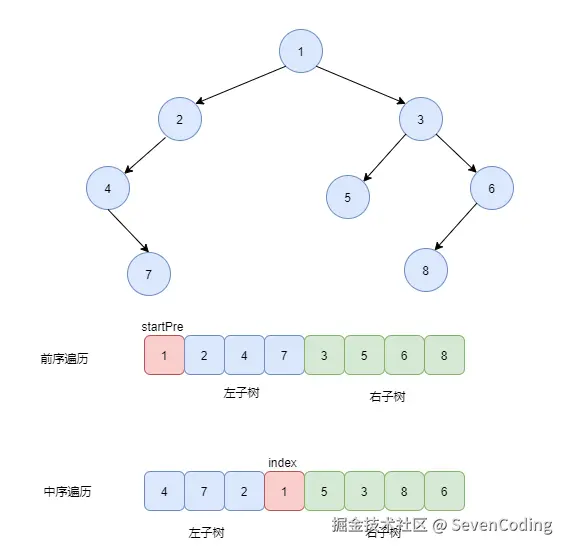 输⼊某⼆叉树的前序遍历和中序遍历的结果,请重建出该⼆叉树。假设输⼊的前序遍历和中序遍历的结果中都不含重复的数字。例如输⼊前序遍历序列{1,2,4,7,3,5,6,8} 和中序遍历序列{4,7,2,1,5,3,8,6} ,则重建⼆叉树并返回。