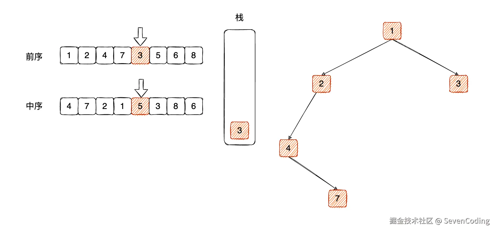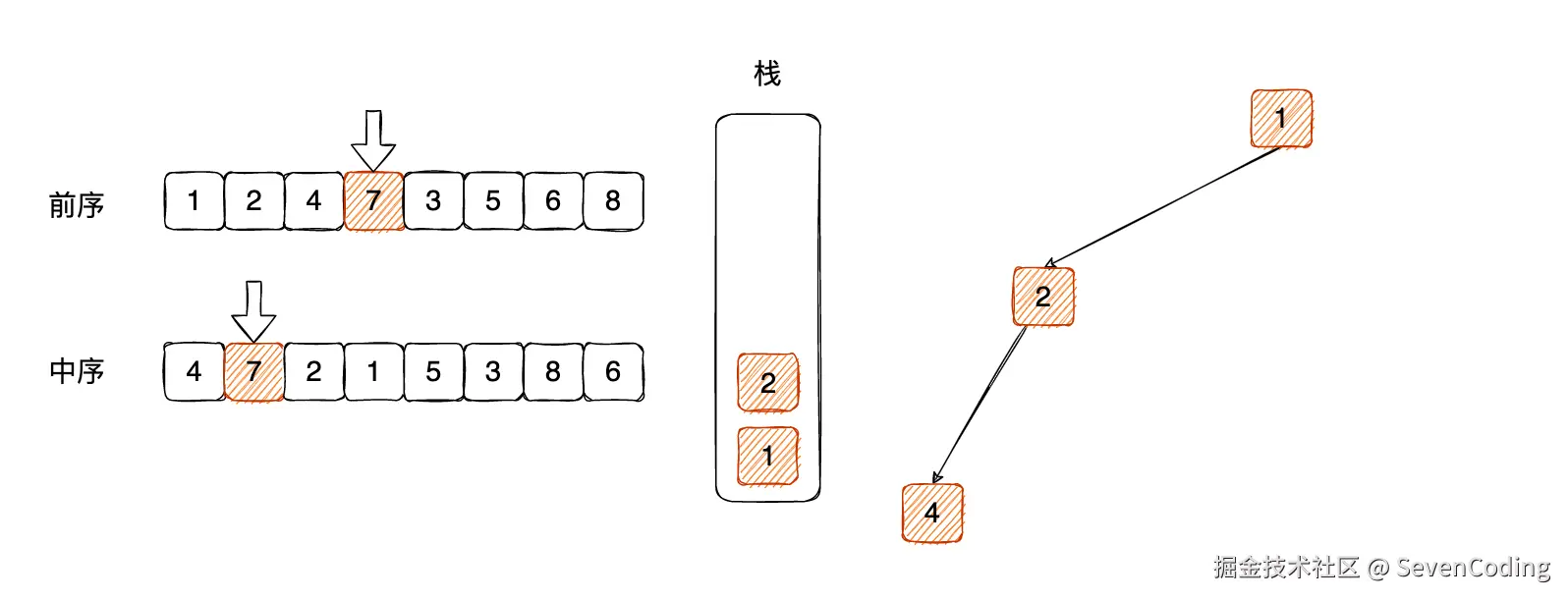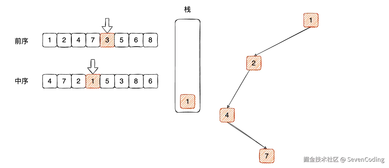 这个时候, 7 肯定是之前节点 4 的右⼦树节点,那么关联关系之后,压⼊栈⾥⾯: