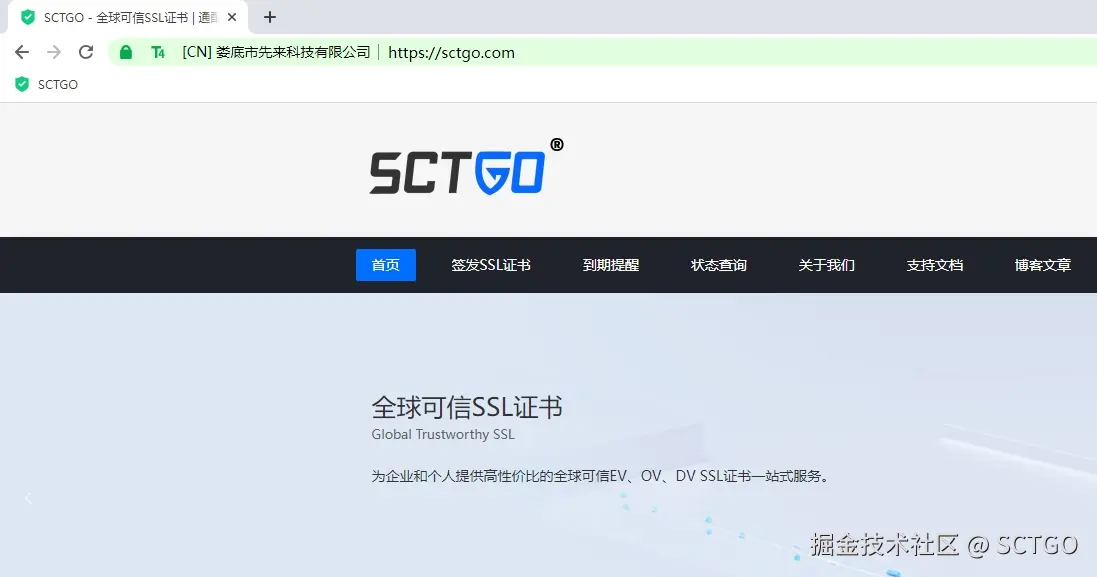 在早期的浏览器上URL地址栏会直接显示域名绑定的公司名字,现在很多浏览器取消了这一特性,但在有些浏览器依旧直接显示公司名字,比如国密浏览器“零信浏览器”还有部分360的浏览器地址栏会直接显示公司名字可以打开sctgo.com测试,我们部署的是EV SSL证书。可以测试效果。