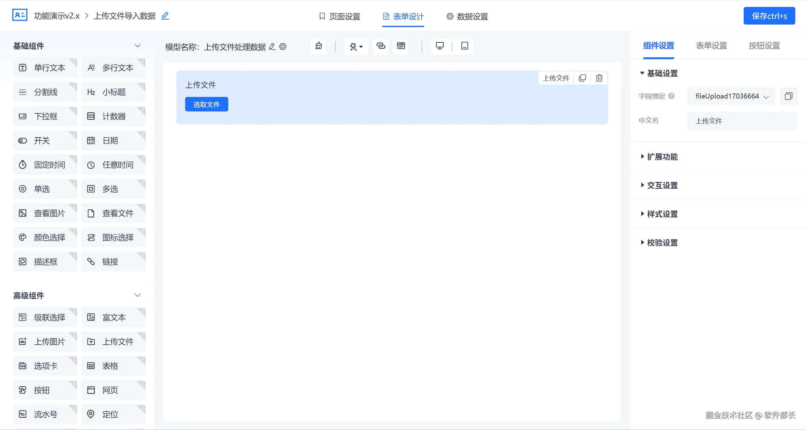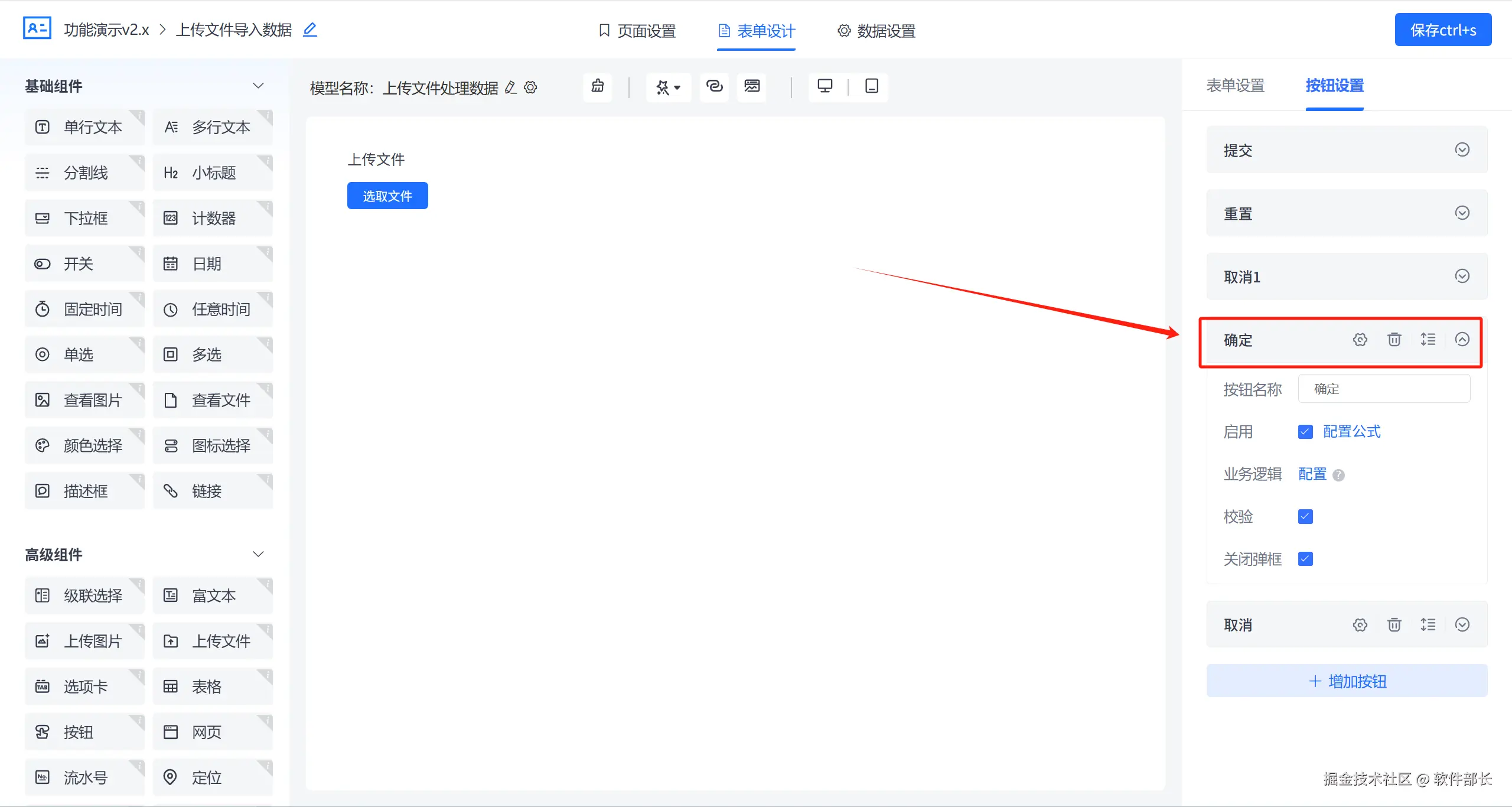 在JVS低代码中,还可以通过“表单上传组件”导入文件后对导入数据进行处理