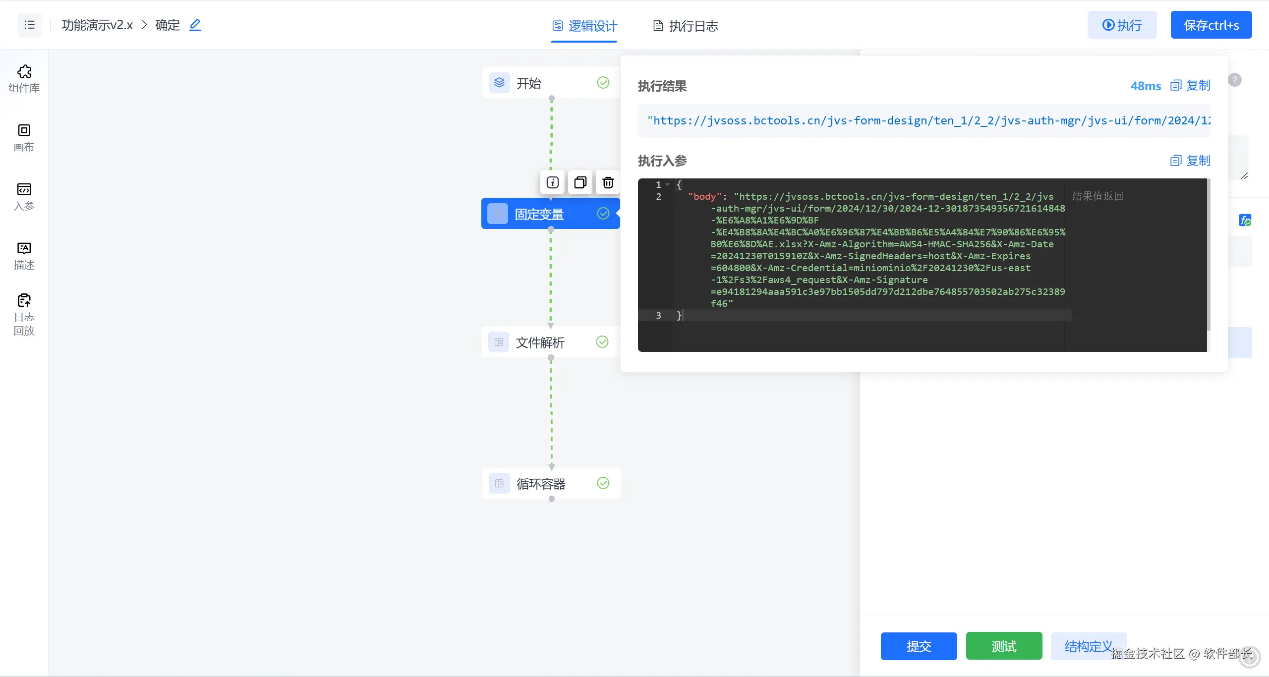 设计思路:通过在列表页添加顶部按钮打开表单上传文件,配置自定义按钮提交触发逻辑,然后在逻辑引擎中对上传的文件解析并将解析的数据新增至列表页中。