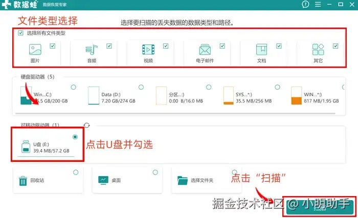 使用数据 蛙恢复专家进行U盘文件恢复,整个操作流程十分简单。大家只需要在软件的首页上选择需要恢复的文件类型和扫描位置,就能一键开始文件的深层扫描,其强大的扫描功能能够帮助我们尽可能扫描到更多的文件。