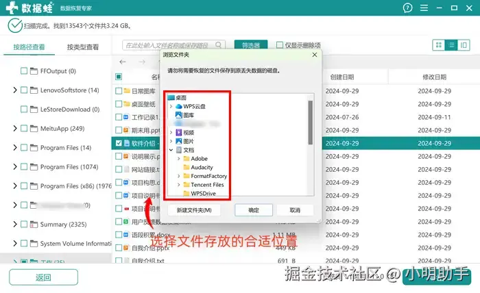 步骤3: 在“浏览文件夹”中选择恢复文件合适的另存位置。