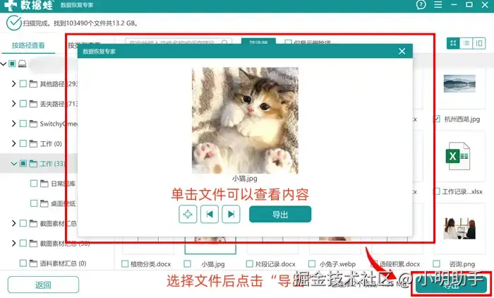 步骤2: 我们会发现,图片文件的内容能够被软件扫描出来,我们能更为方便地找到自己的目标文件;找到目标文件后点击,按下 “导出” 按钮;