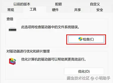 在“此电脑”中用右键按下U盘,选择“属性”后进入该页面;再上方的选项点击“工具”,最后按下“检查”按钮。