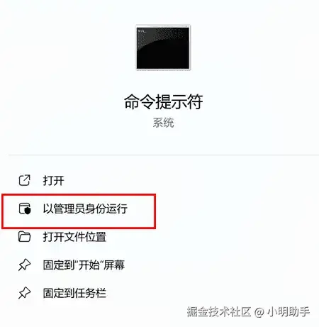 步骤1: 在系统菜单中输入“命令提示符”,找到该功能入口后,选择“以管理员身份打开”;