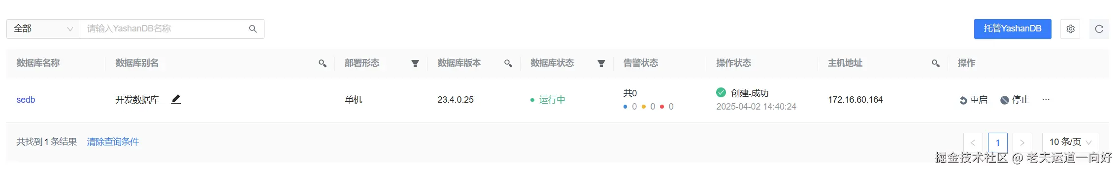 添加成功数据库后,可以在YashanDB列表页查看数据库的基本信息和运行状态,并且可对整个数据库进行一系列操作: