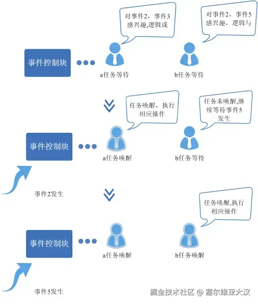 - 任务通过创建事件控制块来触发事件或等待事件。