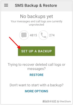 步骤 2: 单击“开始”并允许应用程序访问您的消息。然后点击“设置备份”并启用“消息”选项。