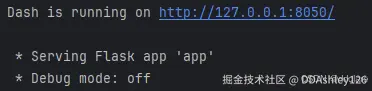 可以看到终端返回了一些信息,Dash应用在本地主机上运行,端口默认8050。在run_server()设置参数port可更改端口,可设置debug=True切换debug模式。