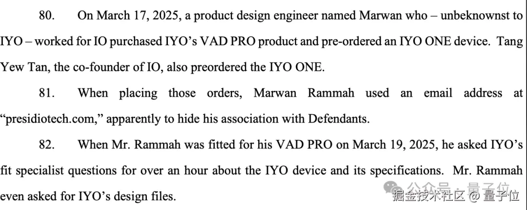 同时,IYO 认为在 2025 年 4-5 月,IO 联合创始人、工程师秘密购买 IYO 产品,试图索取设计文件。