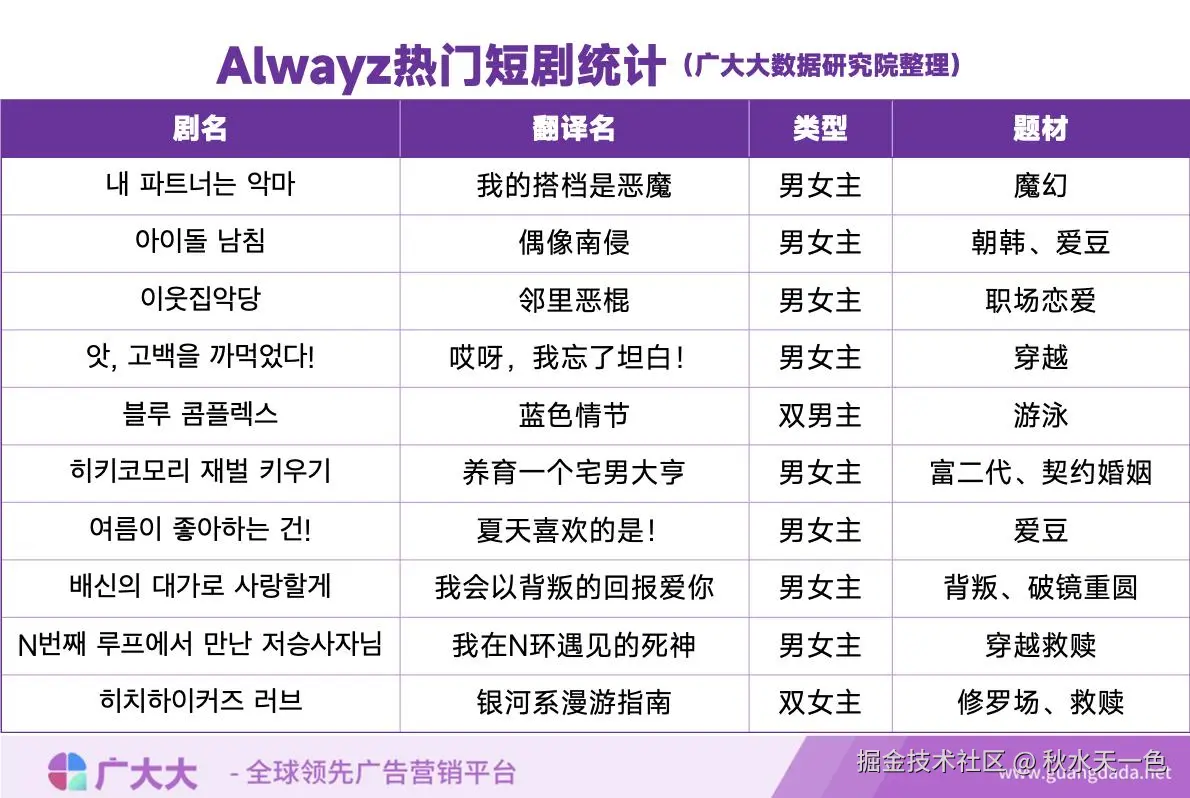 再来看视频素材,与其他喜欢将4-5集剧情融为一体、起步15分钟的超长素材不同,Alwayz的短剧素材总是那么短小精悍,时长基本不会超过90s,近7天投放的短剧素材几乎被新剧《偶像南侵》刷屏霸榜,素材拆解分析如下.