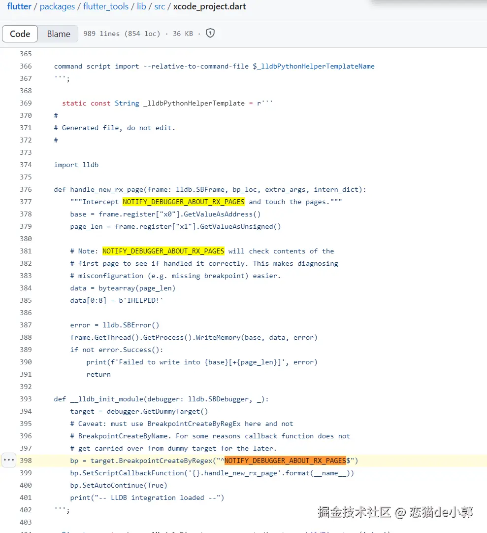 也就是,NOTIFY_DEBUGGER_ABOUT_RX_PAGES 是一个会触发 LLDB 断点的函数,它是通过 flutter_tools 下的脚本进行绑定断点,另外这个函数还有对应声明: