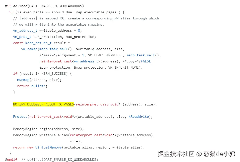 通过 CheckIfRXWorks 的返回结果会直接决定 can_jit 变量的值,进而影响 VM 的后续行为,如果是不能 JIT,那么在VirtualMemory::AllocateAligned 分配内存时,当 Dart VM 为 JIT 代码分配了一块内存区域后,它不再直接尝试调用 mprotect,而是在在真正使用这块内存之前,插入了对 NOTIFY_DEBUGGER_ABOUT_RX_PAGES 的调用 :
