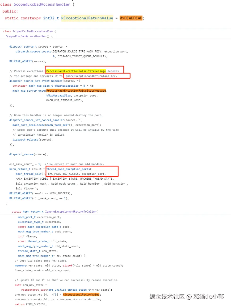 ScopedExcBadAccessHandler()时,它会使用 Mach 内核的thread_swap_exception_portsAPI,为当前线程安装一个自定义的异常处理器 - 通过
