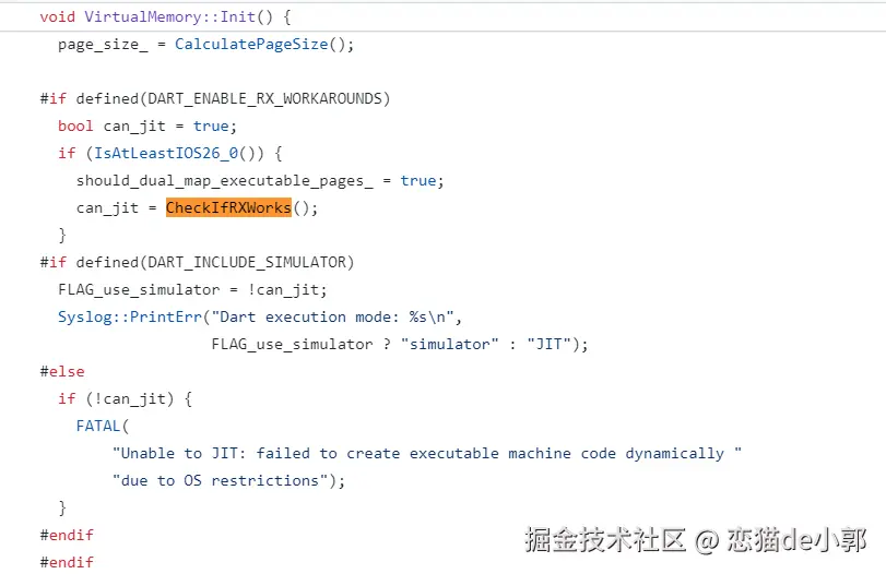 而 CheckIfRXWorks 函数是在启动时判断“可行性检查”,这个函数在 VM 初始化时被调用,用来探测当前的运行环境是否真的允许 JIT 编译: